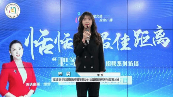 近日,永利集团yl6809学生工作部携手1007福建交通广播全媒体高端互动访谈栏目《恬恬的最佳距离》,开展“职”等你来直播带岗(带人)特别节目。学院2019级国际经济与贸易1班林晨同学作为我校毕业生代表参加线上直播带岗,学院师生观看了本次直播活动。
