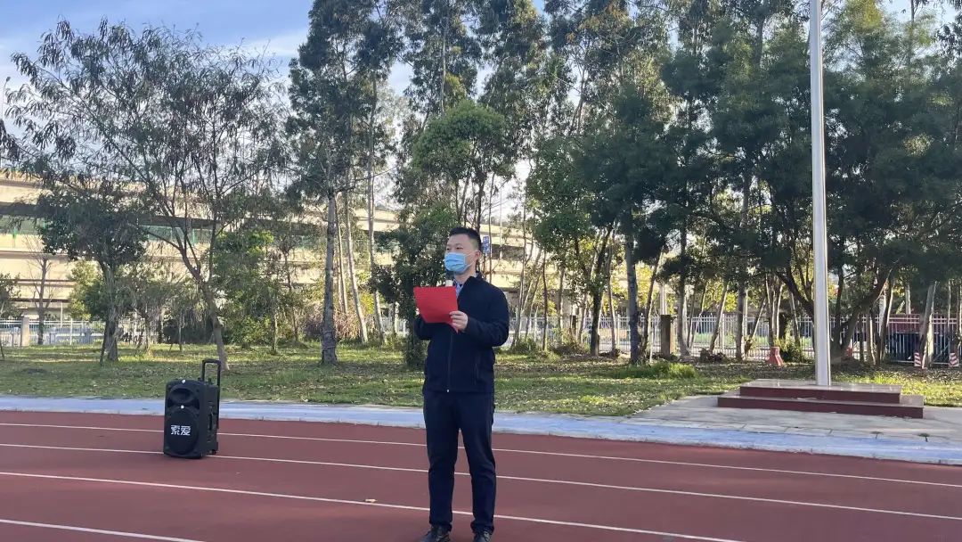 升旗仪式正式开始,国旗护卫队护送国旗至升旗台。全体同学队列整齐,面向国旗行注目礼,鲜艳的五星红旗伴着《义勇军进行曲》,迎着太阳冉冉升起。随后,王祖鑫老师发表了以疫情防控为主题的国旗下讲话,根据国内严峻的疫情防控形势、上级疫情防控指令,结合校园疫情防控管理的工作安排,向同学们发出号召:一是要科学防疫,做守护安全的践行者。二是要敬畏规则,做校规校纪的遵守者。三是要彰显担当,做共克时艰的奉献者。