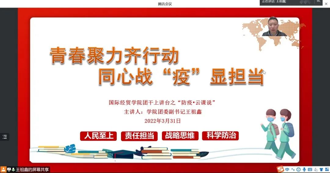 当前疫情防控形势复杂严峻,为积极响应校团委开展“请党放心‘疫’线有我”共青团抗击疫情专项行动,3月31日,yl6809永利团委组织开展“防疫•云课说”,通过线上会议的形式,讲好抗疫思政课。学院团委副书记王祖鑫老师主讲,团委干部及各团支部负责人参加。