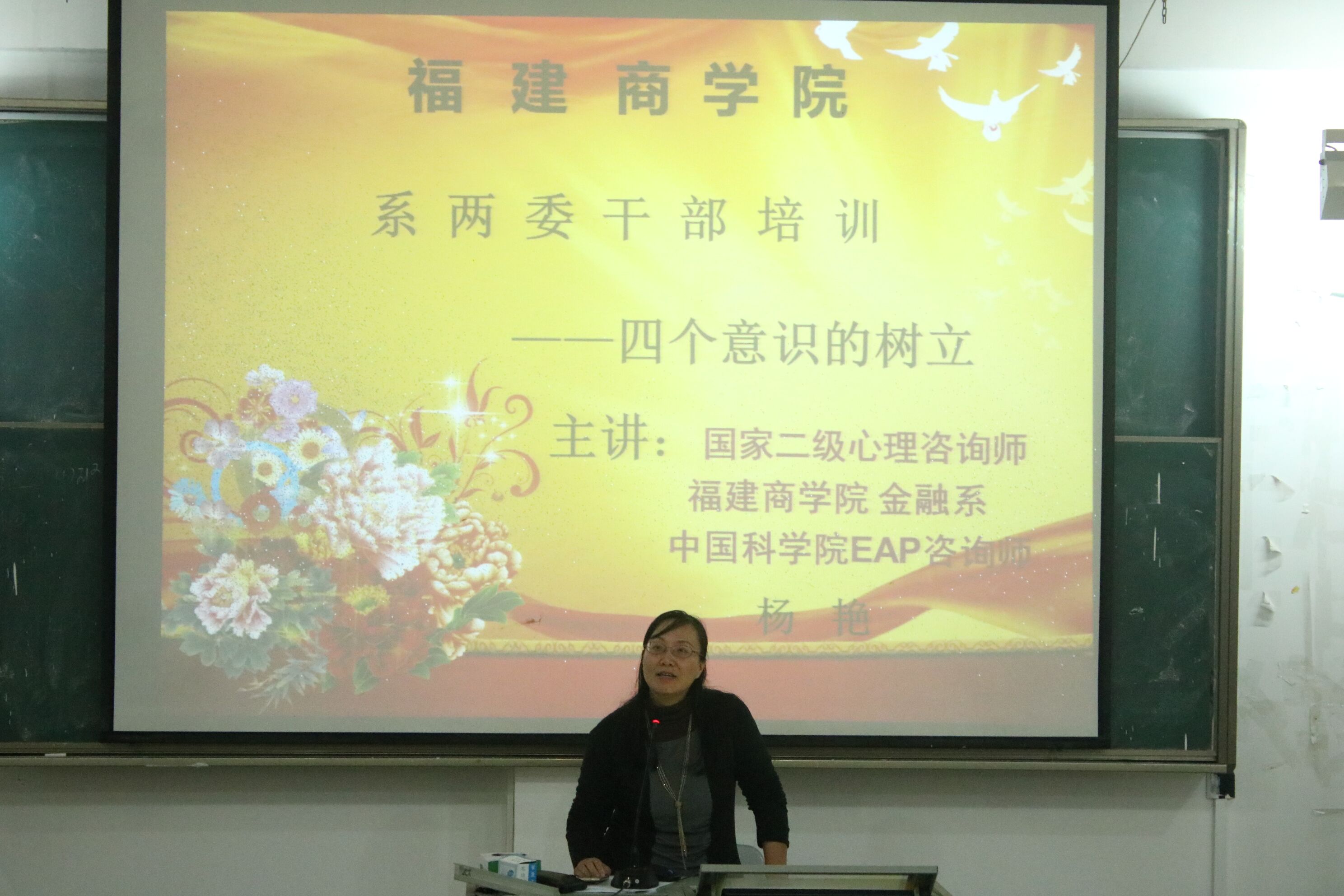 10月16日下午四点,金融系党总支副书记杨艳老师主讲《四个意识的树立》,学习四个意识的同时,强化学生的责任担当。