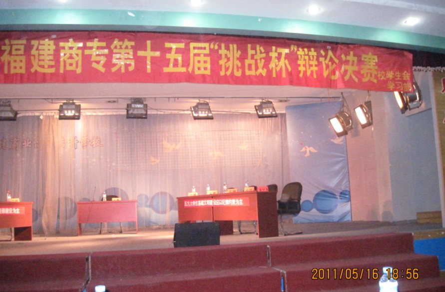 2011年5月16日晚7点整,一场为纪念中共建党九十周年而举办的福建商专第十五届“挑战杯”辩论决赛在我校学生活动中心拉开序幕。我系代表队与会计系代表队一路过关斩将,终于开始了这场巅峰之战。强者之争,孰能更胜一筹?群雄舌战于辩场,争锋相对,精彩无限。