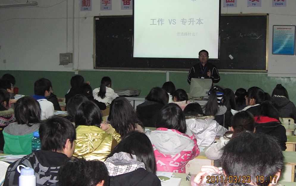 2011年3月23日晚,我系在教学楼101举办了别开生面的专升本讲座,向我系2009级有意愿专升本的同学宣传2012年的专升本相关政策和考试技巧。此次讲座特别邀请了北上教育培训机构的副校长周俊杰先生为主讲,同时系部的相关专业老师也参加了此次讲座。