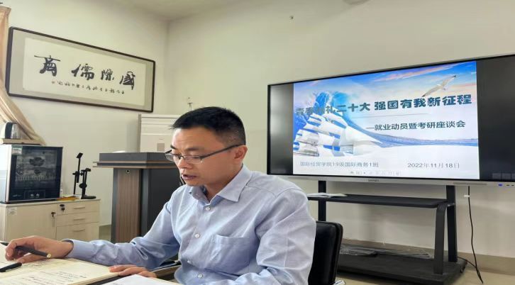 为深入学习宣传贯彻党的二十大精神,2022年11月18日,在聚贤楼三楼会议室,学院党委副书记许模春主持召开“青春献礼二十大,强国有我新征程”的主题座谈会,辅导员及2019级国际商务1班全体学生参加了此次会议。