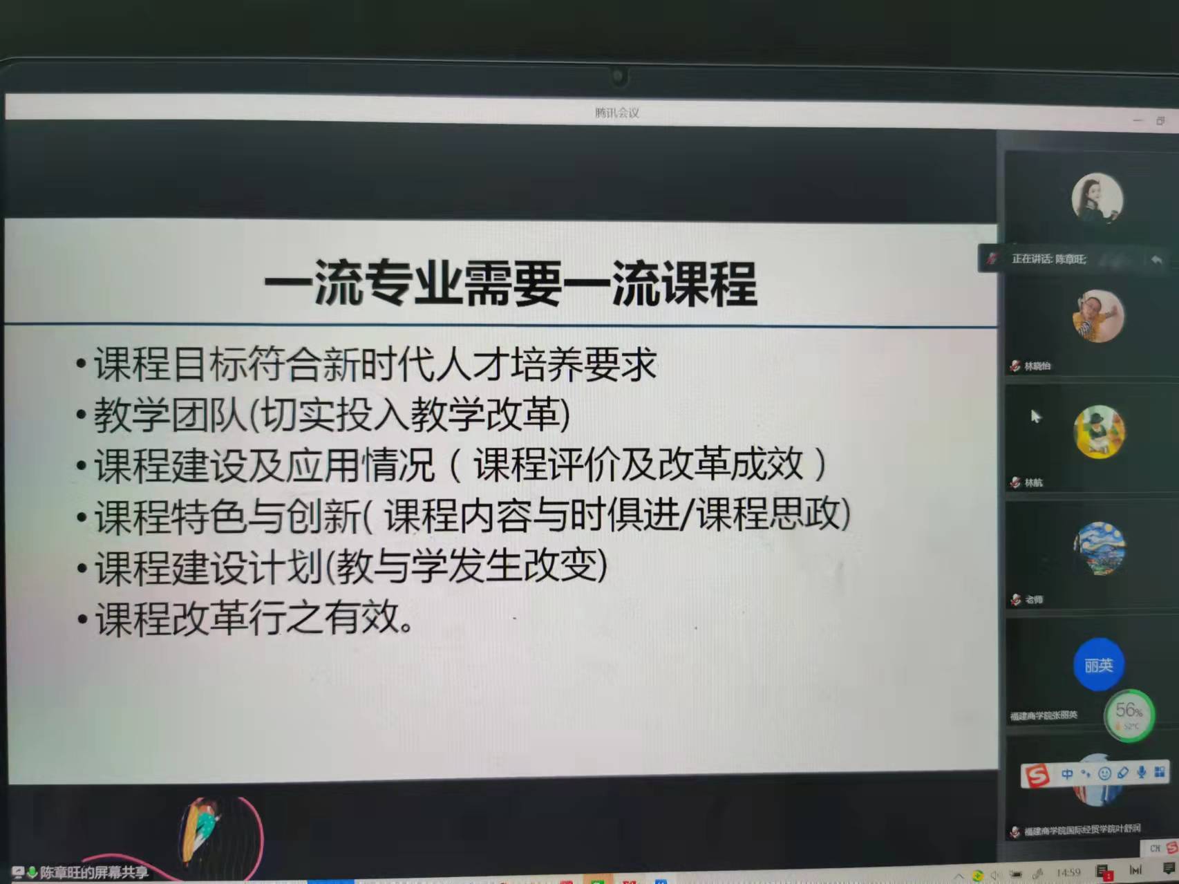 陈章旺教授针对我院国际商务专业申报省级一流本科专业情况提出了宝贵建议,并就老师们提出的学科发展、专业建设中的相关问题进行了互动交流。