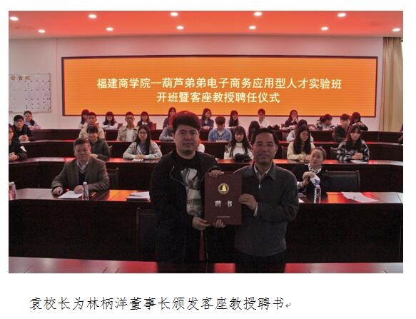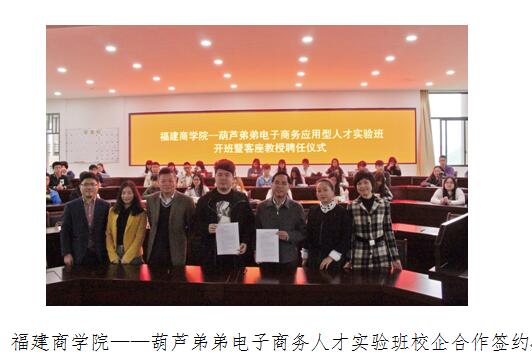 4月13日上午,永利集团yl6809——葫芦弟弟电子商务应用型人才实验班开班暨客座教授聘任仪式在连江校区举行,永利集团yl6809筹建工作领导小组副组长、福建商业高等专科学校校长袁新文和福州葫芦弟弟电子商务有限公司董事长林柄洋共同签署校企合作协议,并颁发客座教授聘书。教务处、实训处负责人和经贸系16级本科全体师生参加了仪式。