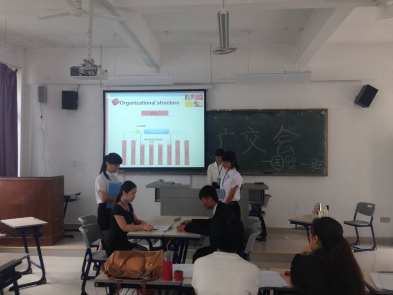 2014620上午,13国贸专业12班分别在教201、教202进行了广交会情景模拟汇演。各小组妆容整洁纷纷登台亮相,在10-15分钟的时间里充分展现出自己两周独立实训来所取得的成果和收获。在汇演中,各小组都能分角色用全英文进行对话,采用PPT显示产品信息和关键词句,完整地模拟了广交会商务磋商的业务情景。各组同学都积极认真的进行准备,大多数小组场景设计合理、注意了商务着装、仪态和言语礼仪。有个别小组表现突出,场景设计新颖、紧凑,PPT制作精美,产品展示、介绍准确到位,注重细节,参与同学都态度认真积极、精神饱满,团队合作意识强,汇报现场气氛热烈,现场展示环节异彩纷呈。各班由指导老师组成评委,评审并给出各小组成绩。